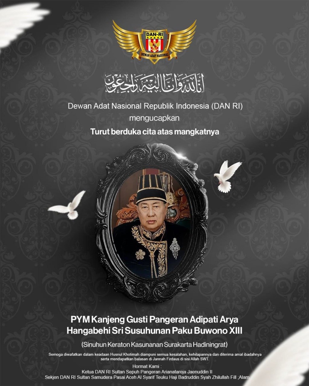 “Kami segenap keluarga besar Dewan Adat Nasional Republik Indonesia (DAN-RI) turut berduka cita yang sebesar-besarnya atas wafatnya Yang Mulia Sinuwun PB XIII. Beliau adalah sosok raja yang arif, berwibawa, dan penjaga kehormatan adat serta budaya Jawa. Semoga almarhum husnul khatimah dan mendapatkan tempat terbaik di sisi Allah SWT,”
