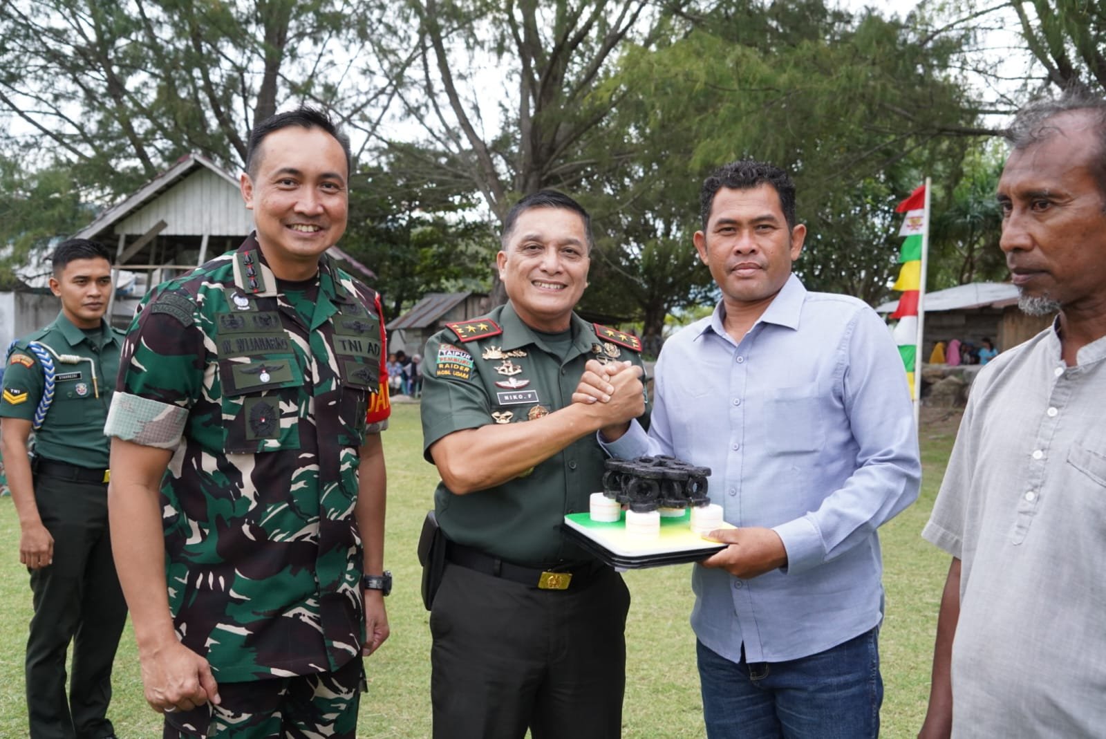 Banda Aceh – Panglima Komando Daerah Militer Iskandar Muda (Pangdam IM), Mayor Jenderal TNI Niko Fahrizal, M.Tr. (Han), menyerahkan bantuan rumpon secara simbolis kepada para nelayan di Lapangan Bola Kaki, Gampong Lamteungoh, Kecamatan Peukan Bada, Kabupaten Aceh Besar, pada Senin (2/12/2024). Kegiatan ini merupakan bagian dari program kepedulian Kodam Iskandar Muda dalam mendukung peningkatan kesejahteraan masyarakat, khususnya nelayan.