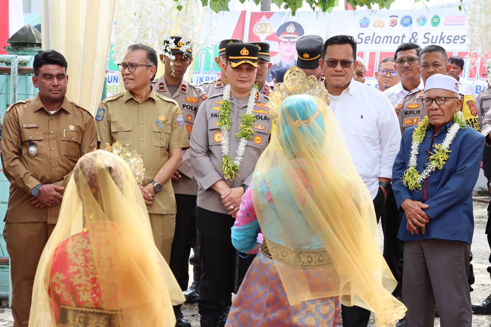 Kapolres Pidie Jaya, AKBP Ahmad Faisal Pasaribu, S.H., S.I.K., M.H., disambut hangat dengan pengalungan bunga oleh Duta Kamtibmas sebagai simbol solidaritas dalam upaya melawan narkoba.